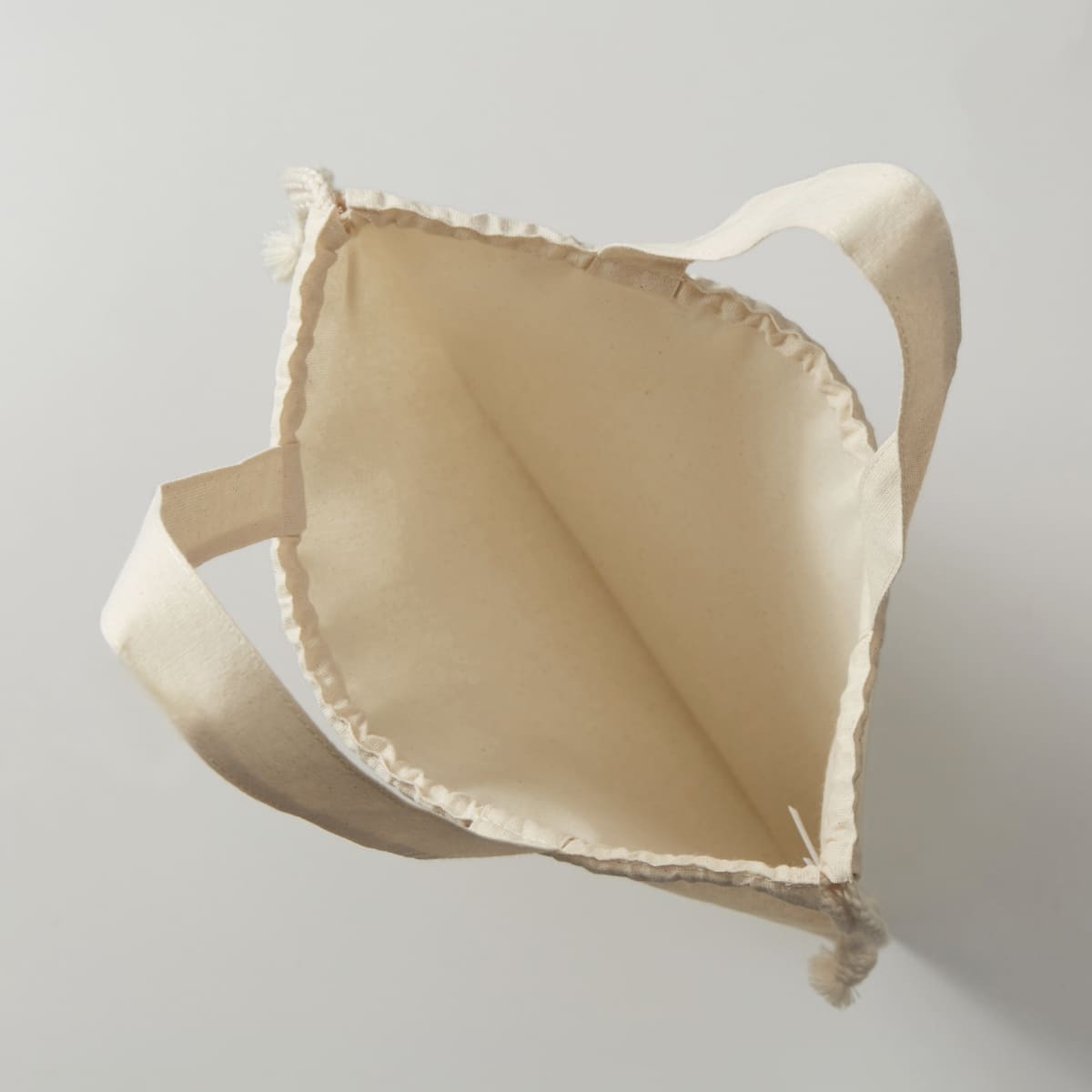 気軽に持てるワンマイルバッグやメインバッグ、大きめの巾着ポーチ、バッグインバッグなどとして使える、汎用性の高いハイコスパな巾着バッグ。スクエア形の巾着は見た目がかわいいだけでなく、ものを取り出すときに奥までしっかり見えるため使いやすいのが嬉しいポイント。袋口のドローコードは、何度もリテイクを重ねたこだわりのある仕上がり。袋の開け閉めがしやすく、ぎゅっと閉めればアクセントになります。ラフな見た目ながらしっかりとした素材なので、結んでも、垂らしても、ほどよくこなれた印象を演出できます。オリジナル雑貨やエコバッグ、販促物のベースなど、幅広い用途にアジャストします。