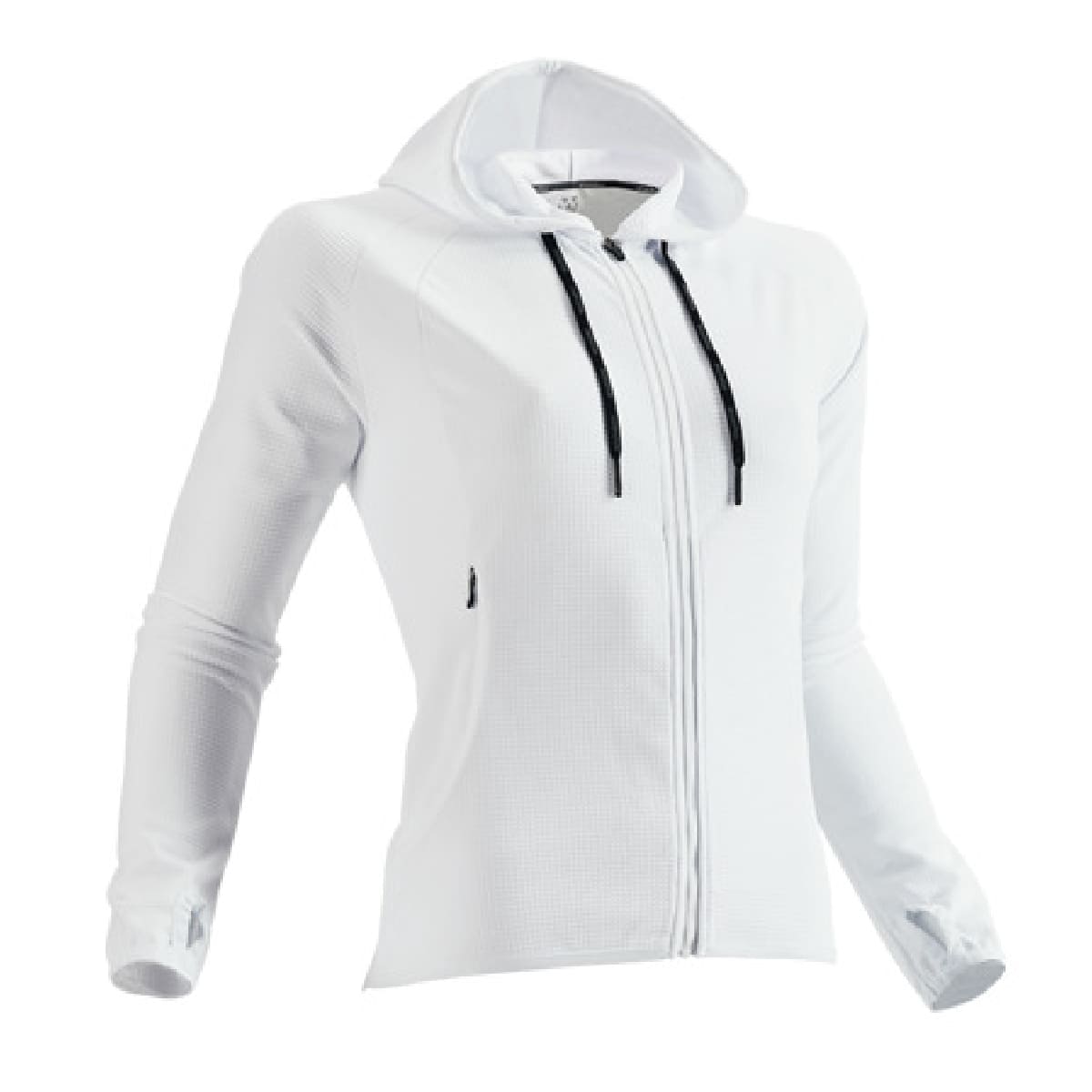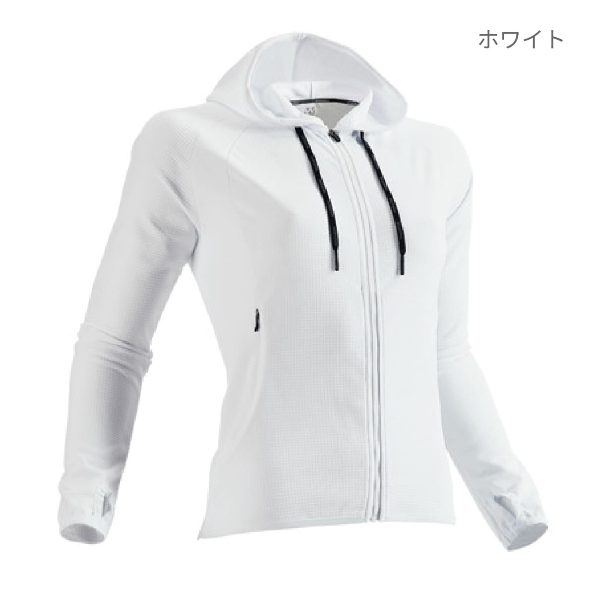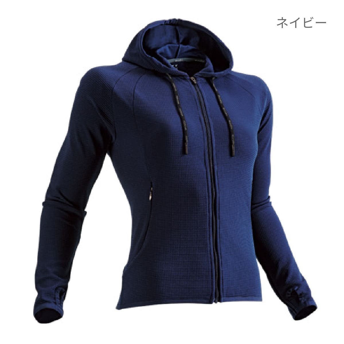 ワッフルニット素材のフィットネス用パーカー ウエスト周りを細く絞ったフェミニンなラインで体に程よくフィットするパーカー。